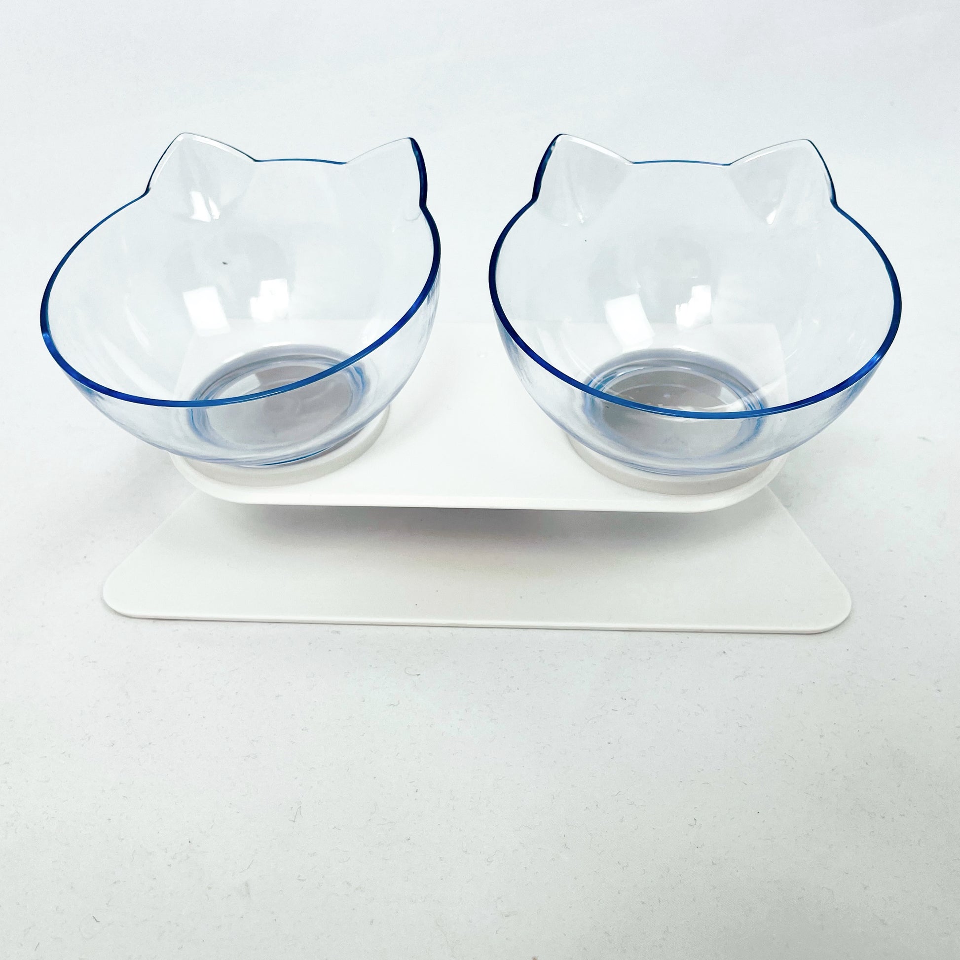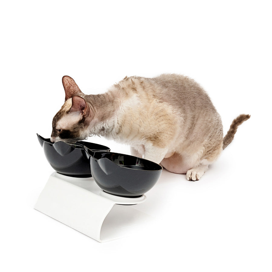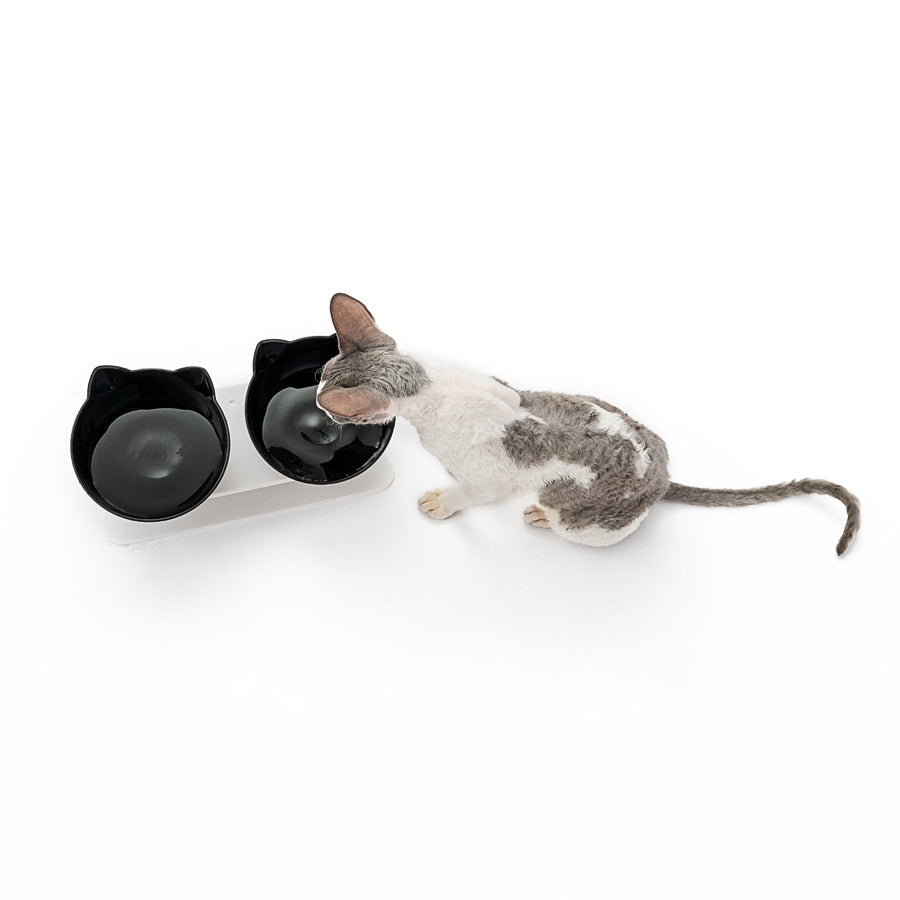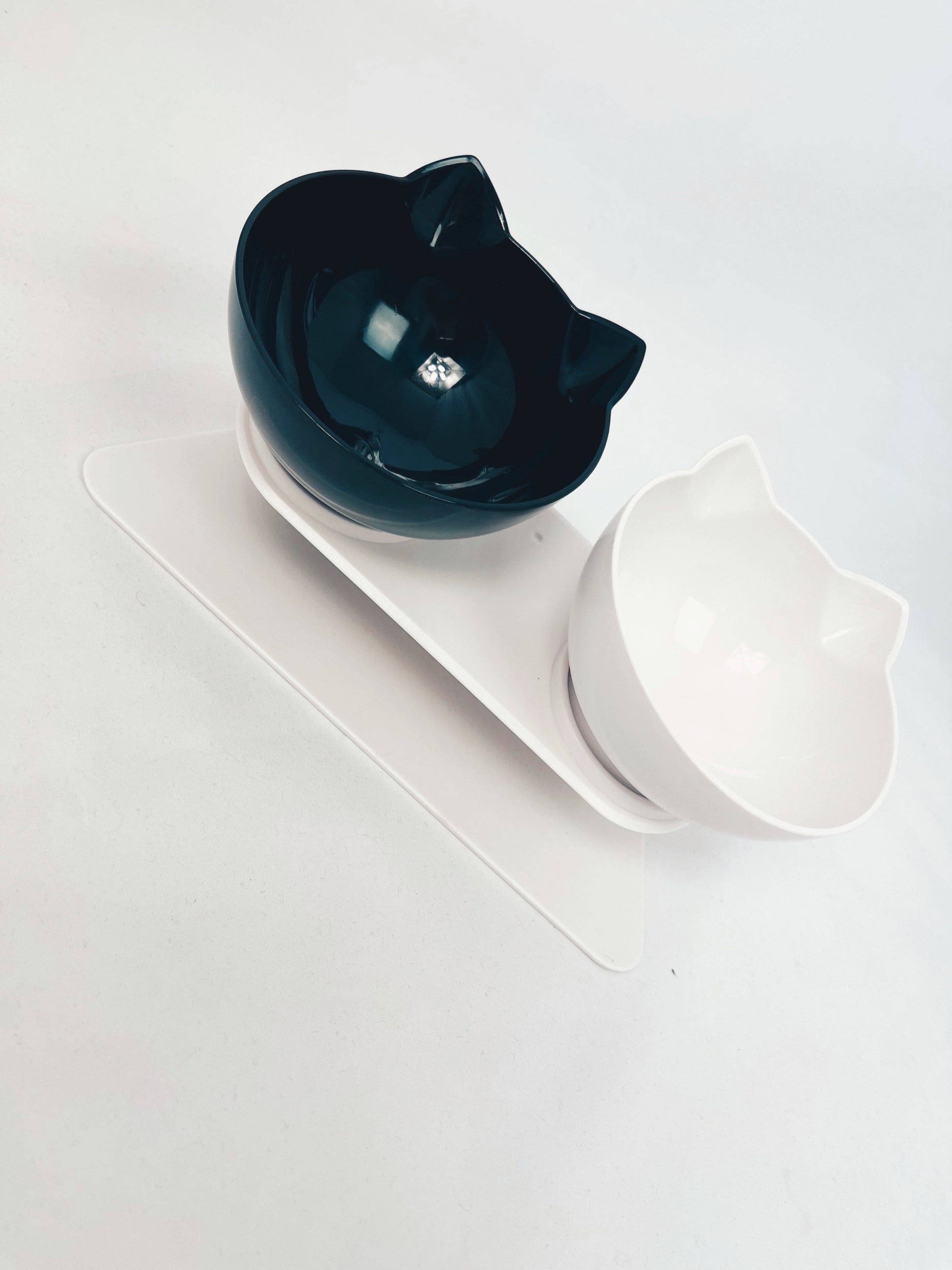 Set of elegant cat head shaped food and water bowls. The ergonomically shaped base holds the bowls in a position that is natural for cats. It is proven that food served in this way does not have a negative effect on your pet's cervical spine health.