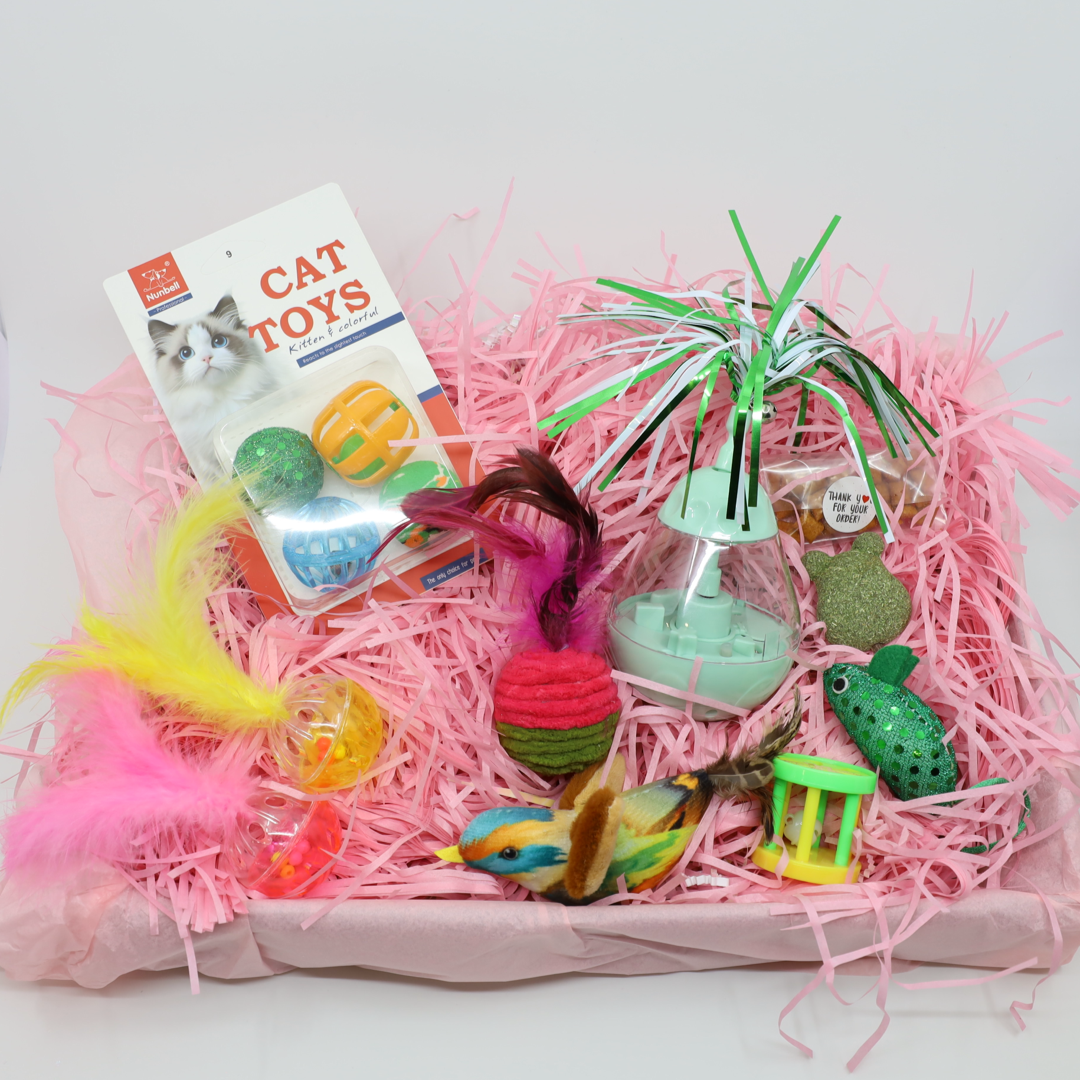 Tahle dárková sada je splněný sen každé aktivní kočky – a zároveň záchrana pro všechny páníčky, kterým se nechce běhat po obchodech a balit dárky do tří vrstev papíru. Otevíráte hotovou krabici plnou barevných hraček, které lákají k lovu, skákání a bláznivým sprintům po bytě. Vy jen kliknete na „koupit“, položíte balíček pod stromeček a máte splněno.