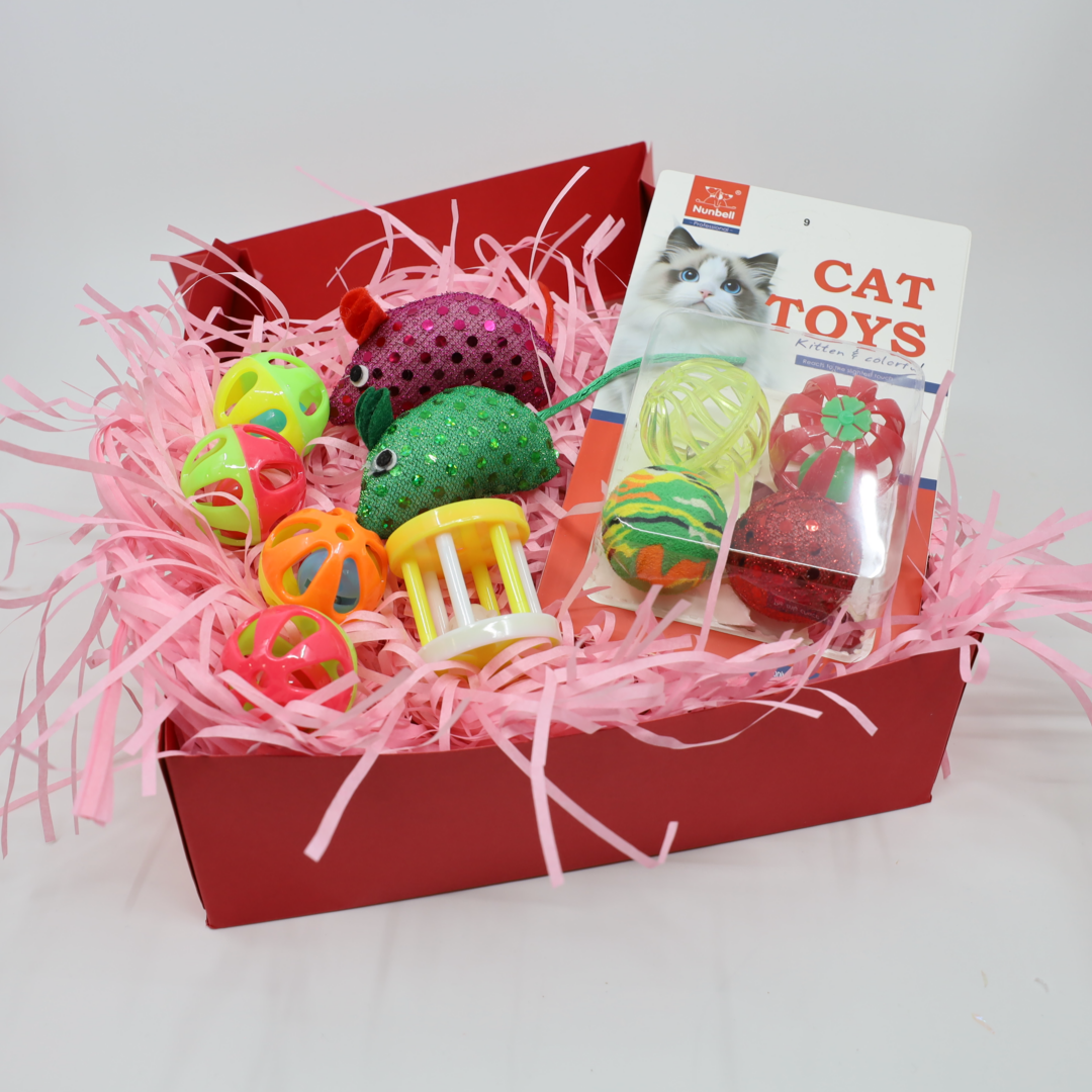 Uvnitř krásné dárkové krabičky se schovává výběr pestrých hraček, které kočky opravdu využijí – rolničkové míčky, chrastící plastové hračky, měkoučké myšky a další drobnosti, které kočku zabaví víc než vaše nová váza. Všechny textilní hračky jsou navoněny šantou kočičí, takže u většiny koček téměř garantujeme okamžitý „wooow“ efekt. Vůně šanty dokáže kočky přitáhnout, nabudit a přimět je hrát si déle a s větším nadšením.