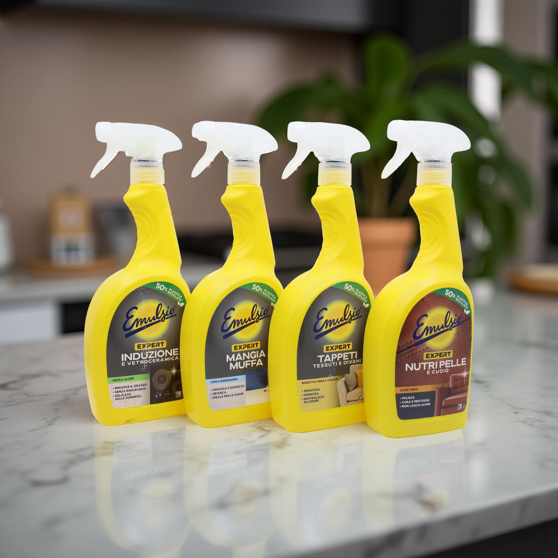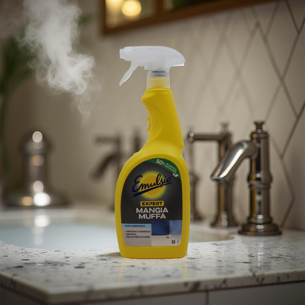 Emulsio Expert Mangia Muffa 600 ml je profesionálně laděný sprej proti plísním, který tvoří hustou bělicí pěnu. Ta plíseň rozloží přímo na povrchu, pomáhá dezinfikovat vlhká místa a bělí spáry, aniž by poškozovala glazuru obkladů. V koupelně, kuchyni i na dlažbě kolem bazénu pracuje rychle a přesně, aby se plíseň znovu nevracela. Obal je vyroben z 50 % z recyklovaného plastu; při správném větrání a dodržení návodu je to rozumná, bezpečná volba i do domácností se zvířaty, kde chcete účinně řešit problém, ne jen maskovat zápach